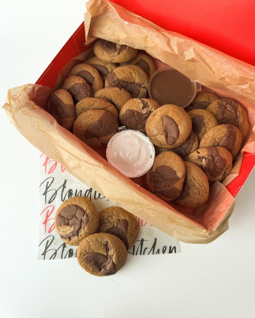 All of our cookies are hand rolled, finished and baked fresh daily. Unlike other large chains, we are a small batch bakery using quality ingredients including pure butter, unrefined sugar, Cotswold flour and free range eggs. We individually roll each cookie dough ball and weigh every chocolate chip (amongst other toppings) into our cookies for perfect eating every time.