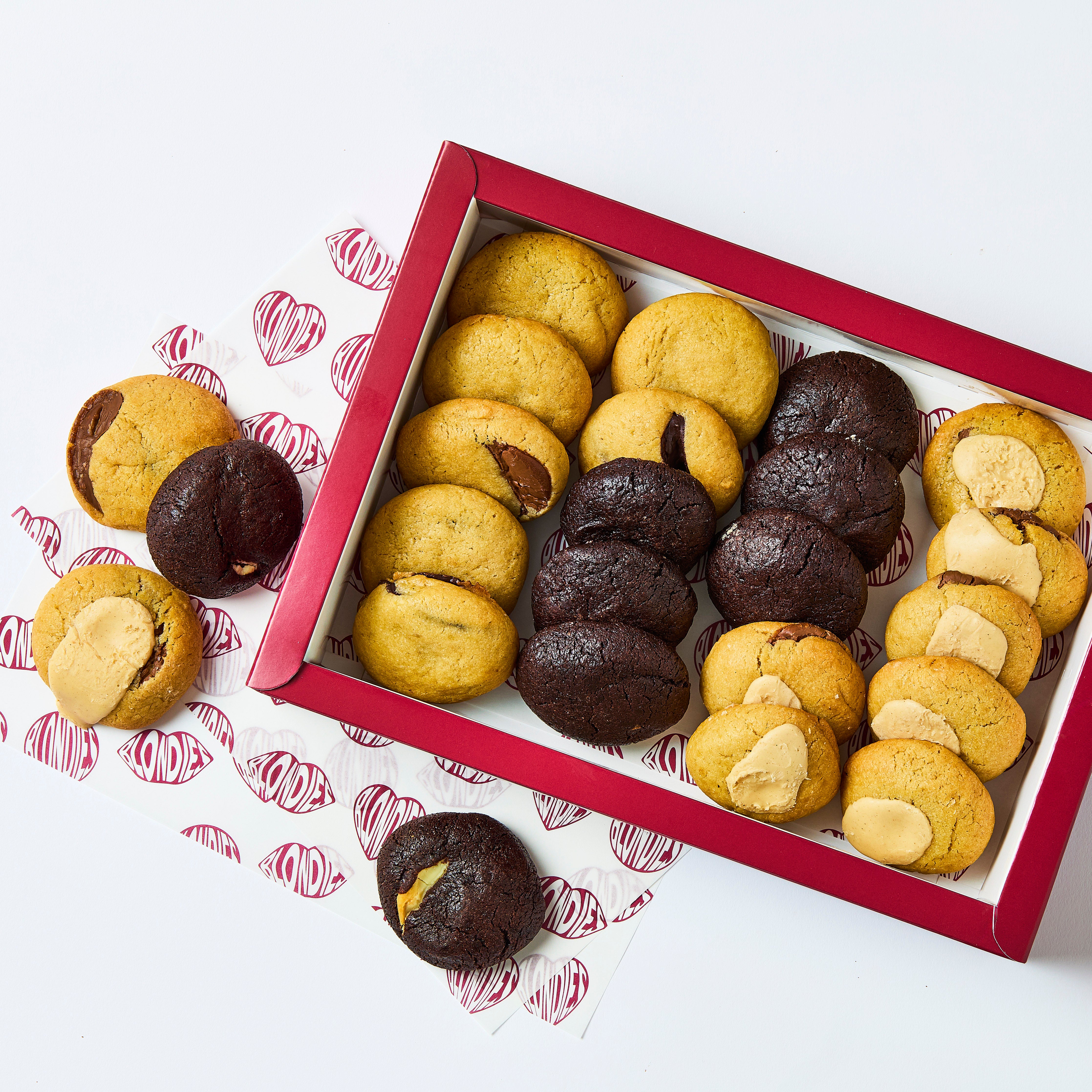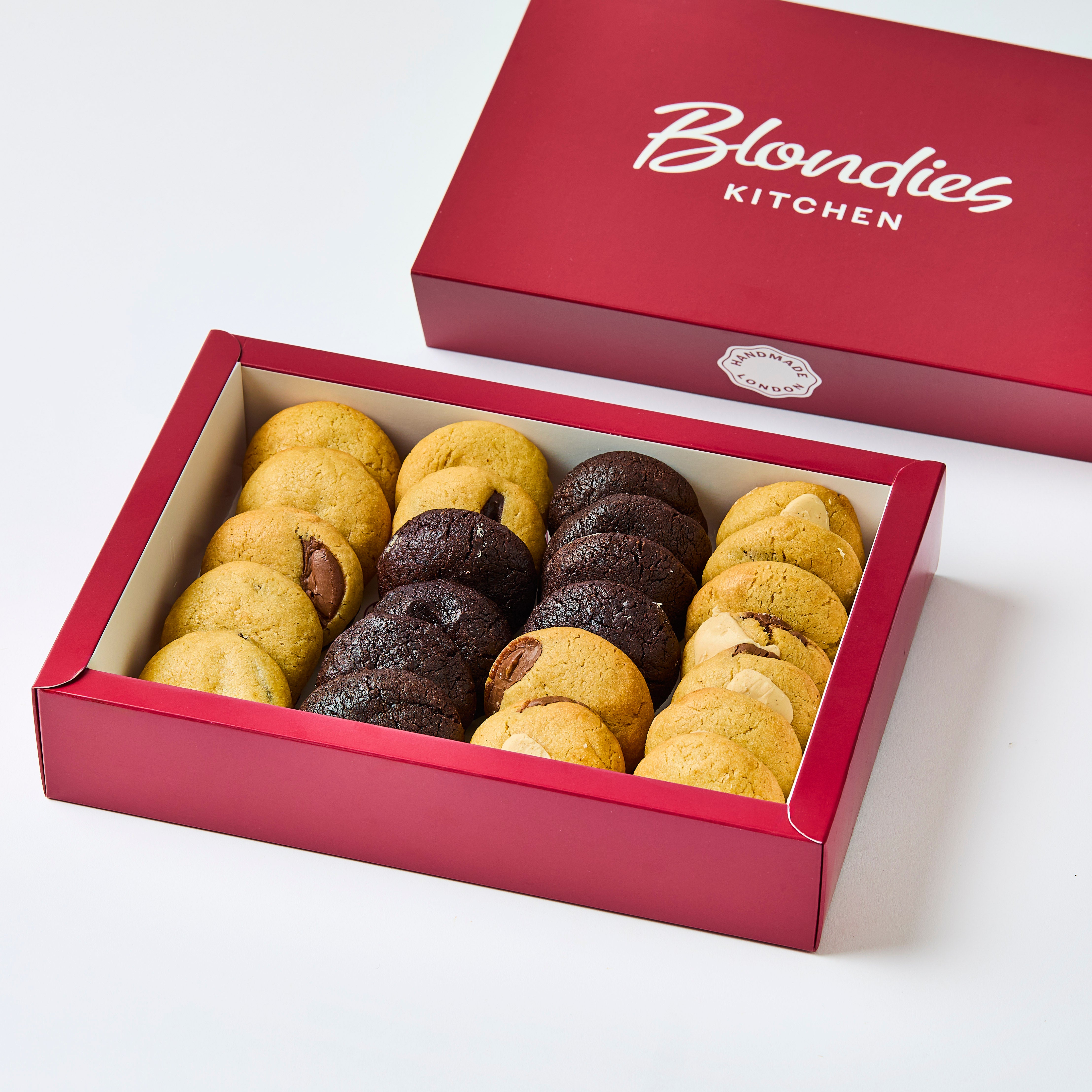 We’re Not Fudging Around Cookie Ingredients: Self Raising Flour (Wheat Flour, Calcium Carbonate, Iron, Niacin (B3), Thiamine (B1)] Raising agents, Sodium Bicarbonate, Monocalcium Phosphate)) Soft Brown Sugar, Butter (MILK), EGGS, Caster Sugar, Cocoa powder, White Chocolate (Sugar, Cocoa butter, Whole MILK powder, Emulsifier: SOYA Lecithin, Vanillin), Vanilla Paste (Sugar, Water, Bourbon Vanilla extract, Spent Vanilla Pods, Thickener (tragacanth gum), Caramel (sugar, water), Preservatives (potassium sorbate)), Salt, Baking Powder (WHEAT Flour, Calcium Carbonate, Iron, Niacin, Thamine), Raising Agents (Sodium Acid Pyrophosphate, Sodium Bicarbonate).