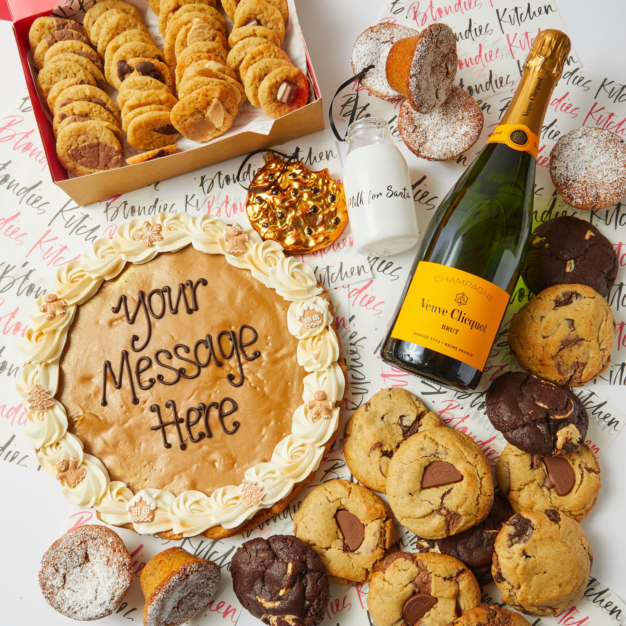 Ingredients: Self Raising Flour (WHEAT Flour, Calcium Carbonate, Iron, Niacin (B3), Thiamine (B1)] Raising agents, Sodium Bicarbonate, Monocalcium Phosphate)) Soft Brown Sugar, Butter (MILK), EGGS, Caster Sugar, Cocoa powder, White Chocolate (Sugar, Cocoa butter, Whole MILK powder, Emulsifier: SOYA Lecithin, Vanillin), Vanilla Paste (Sugar, Water, Bourbon Vanilla extract, Spent Vanilla Pods, Thickener (tragacanth gum), Caramel (sugar, water), Preservatives (potassium sorbate)), Salt, Baking Powder (WHEAT Flour, Calcium Carbonate, Iron, Niacin, Thamine), Raising Agents (Sodium Acid Pyrophosphate, Sodium Bicarbonate).