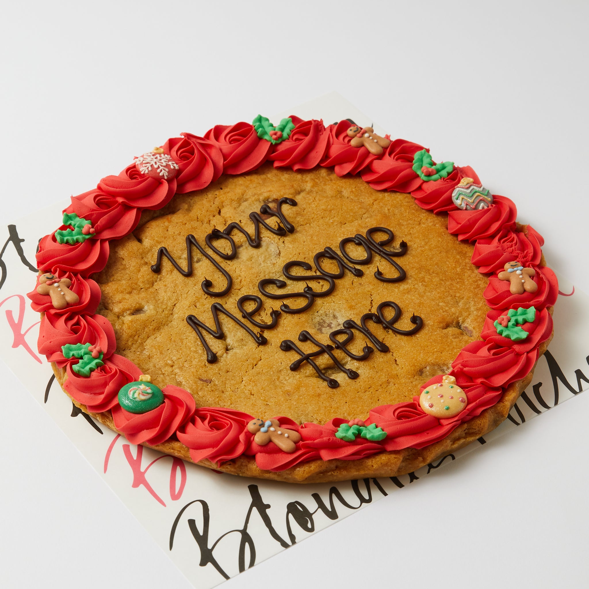 Giant 12 Inch Milk Choc cookie, with a red iced border, choc message and topped with Christmas sugar decorations!