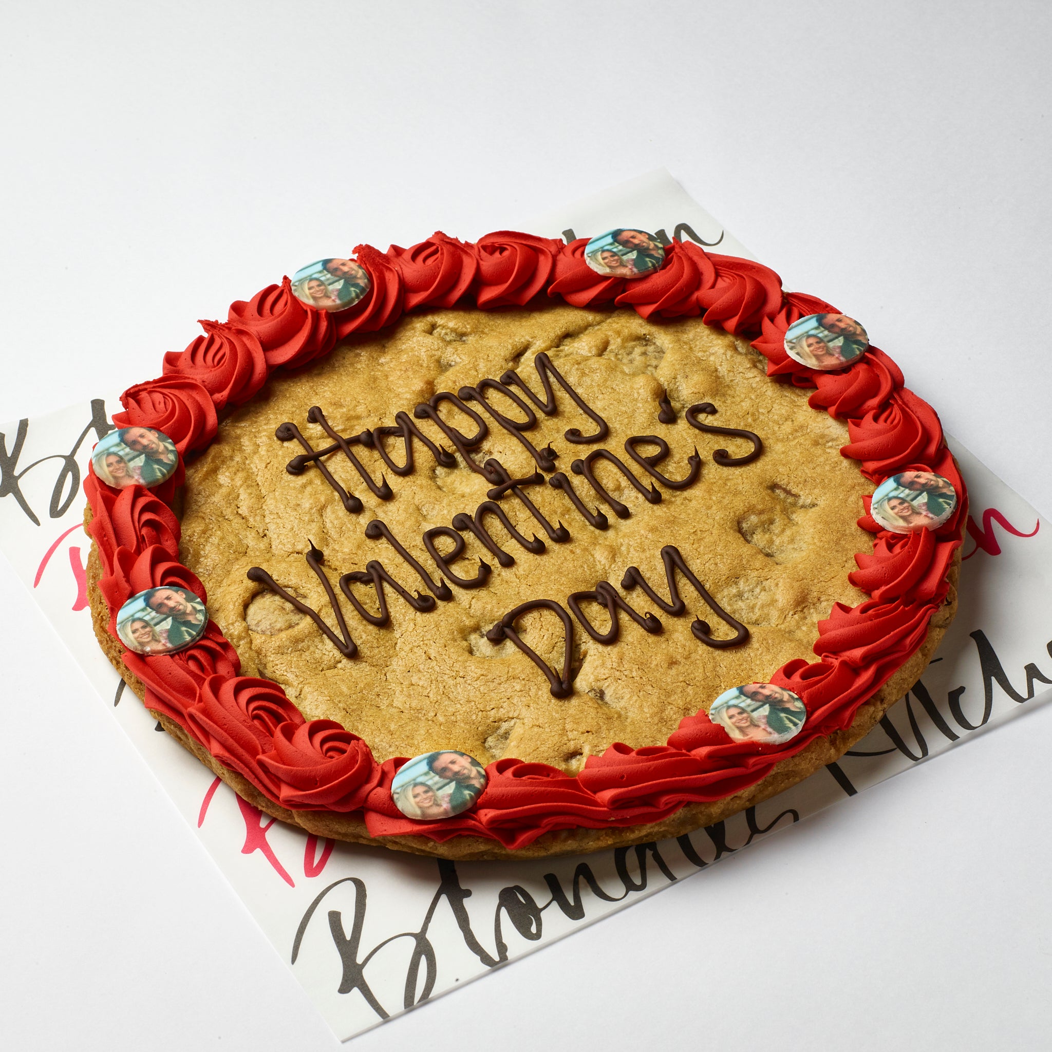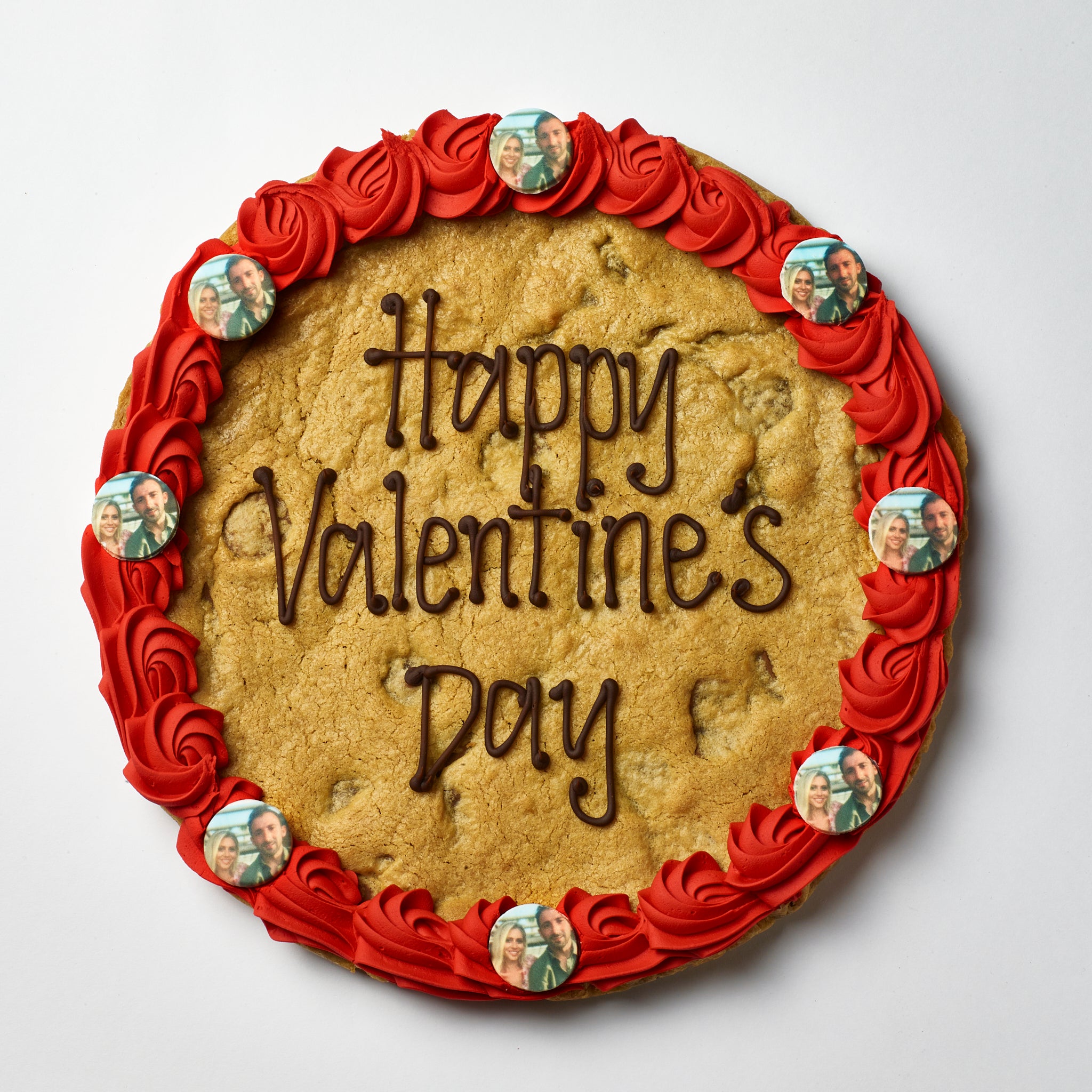 Milk Choc 12 inch cookie base topped with red vanilla frosting, a personalised chocolate fudge message and fondant mini logo discs with any image or logo of your choice. - A New Valentines take on our bestselling Giant Photo Upload Your Photo Cookie!