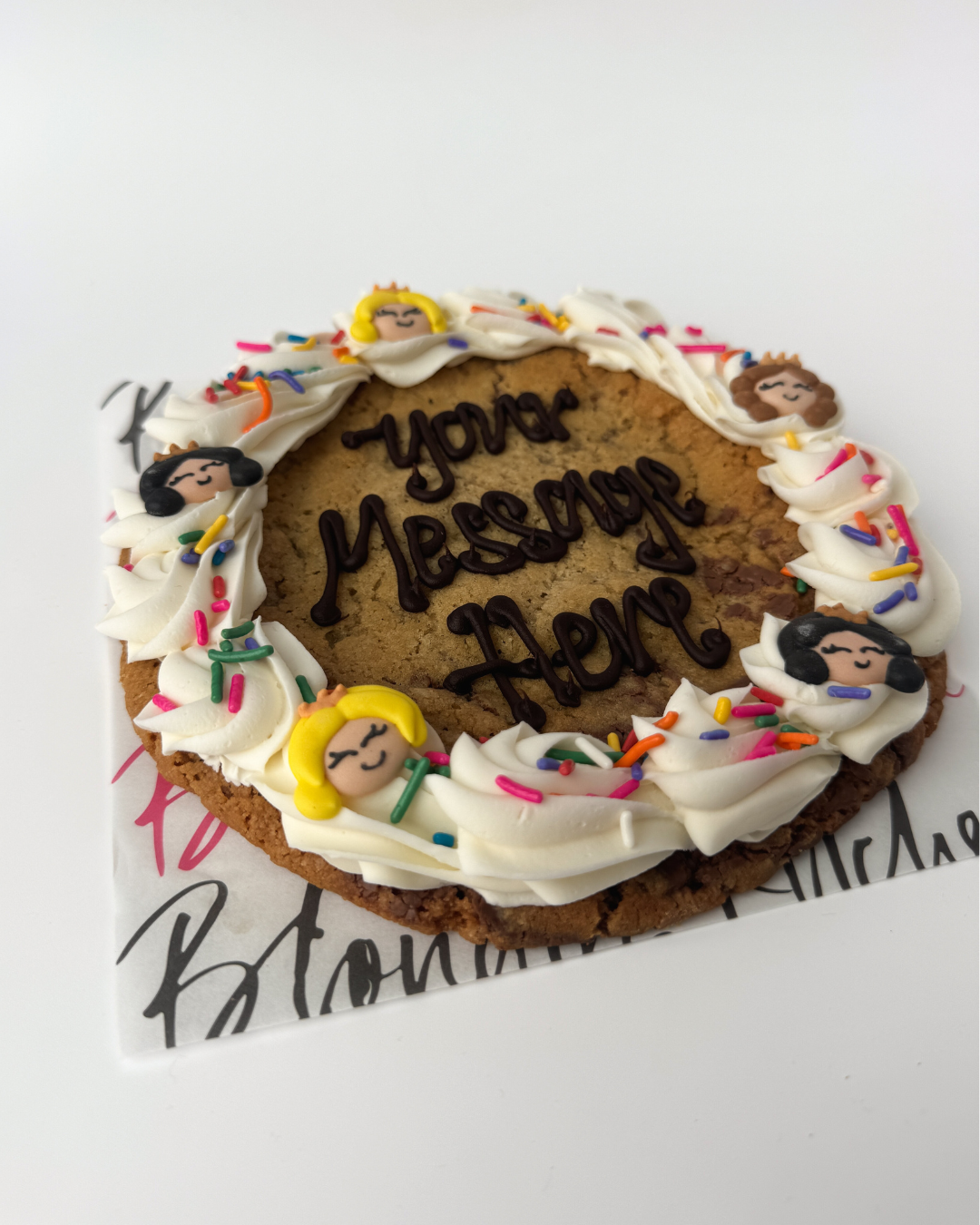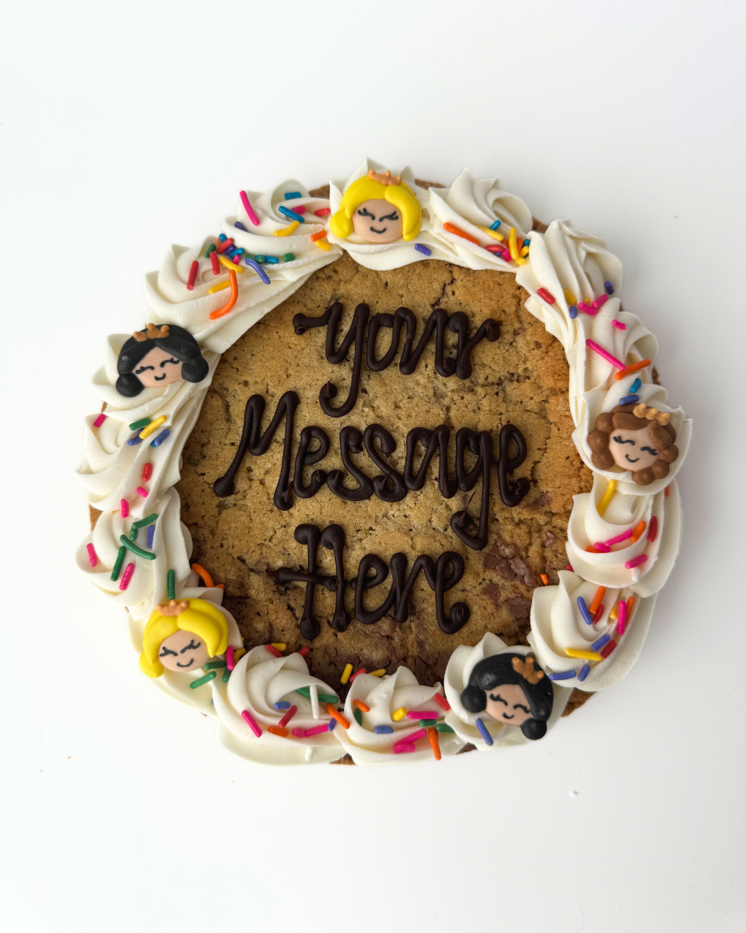 Milk Chocolate 7 inch Cookie, topped with vanilla sprinkles, piped with vanilla Icing Border and Princess Sugar Decorations