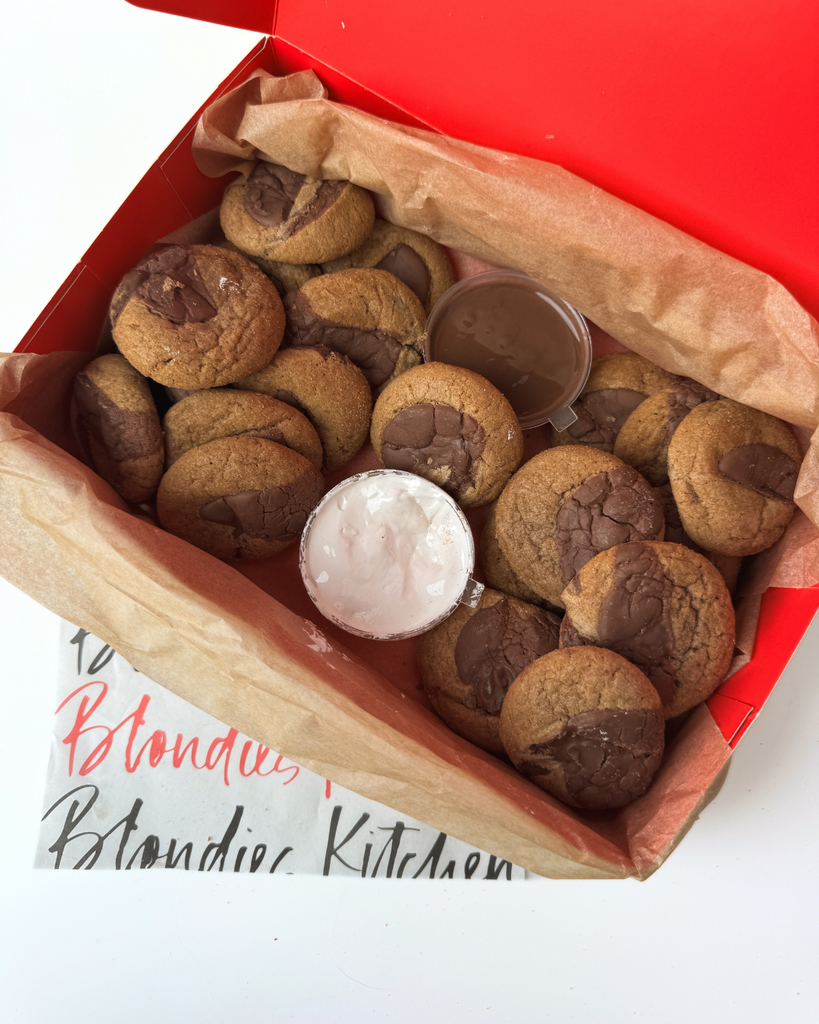 Milk Choc Chunk & Pumpkin Spice NYC Thic Style Bitesize Cookies with 1 x Milk chocolate and 1 x Marshmallow dipping sauces