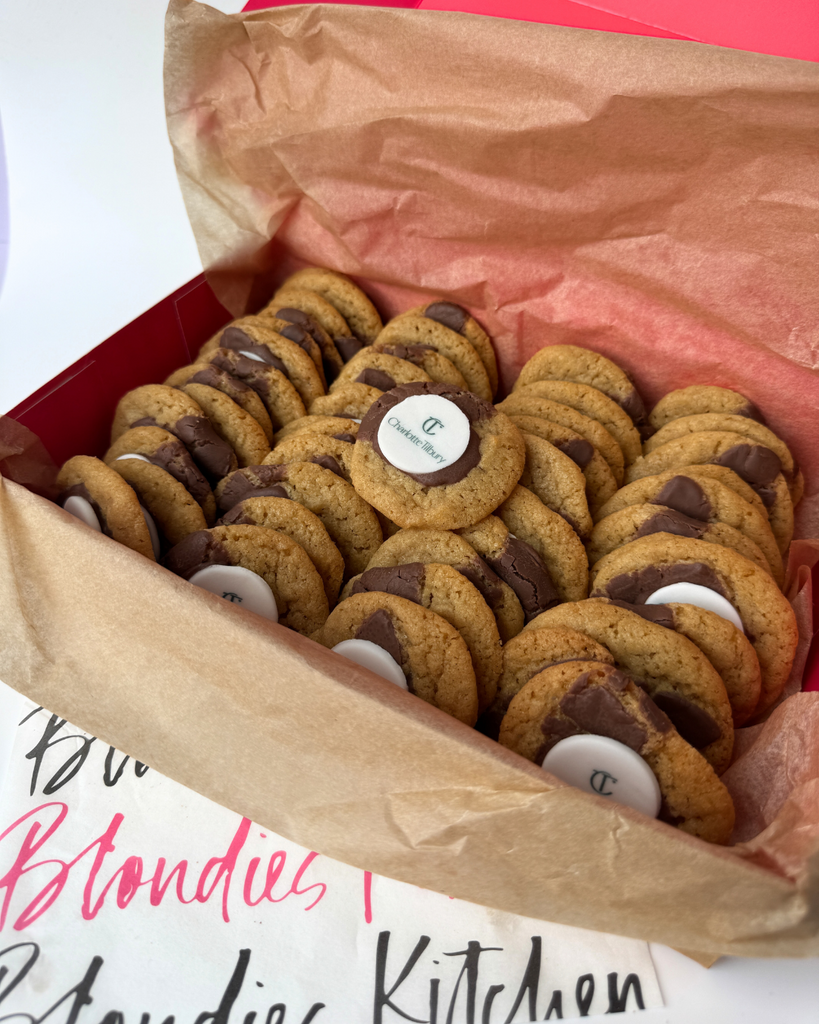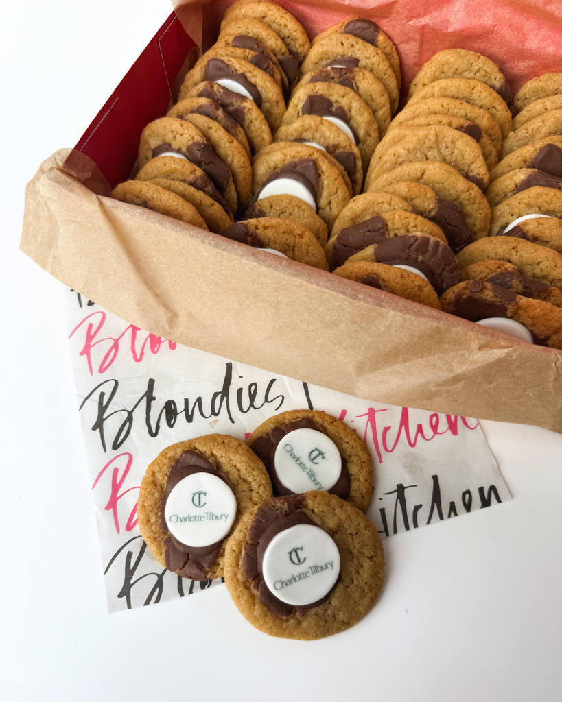 Mini Milk Chocolate Signature chewy cookies topped with an iced fondant disc including your image, logo or message of choice.