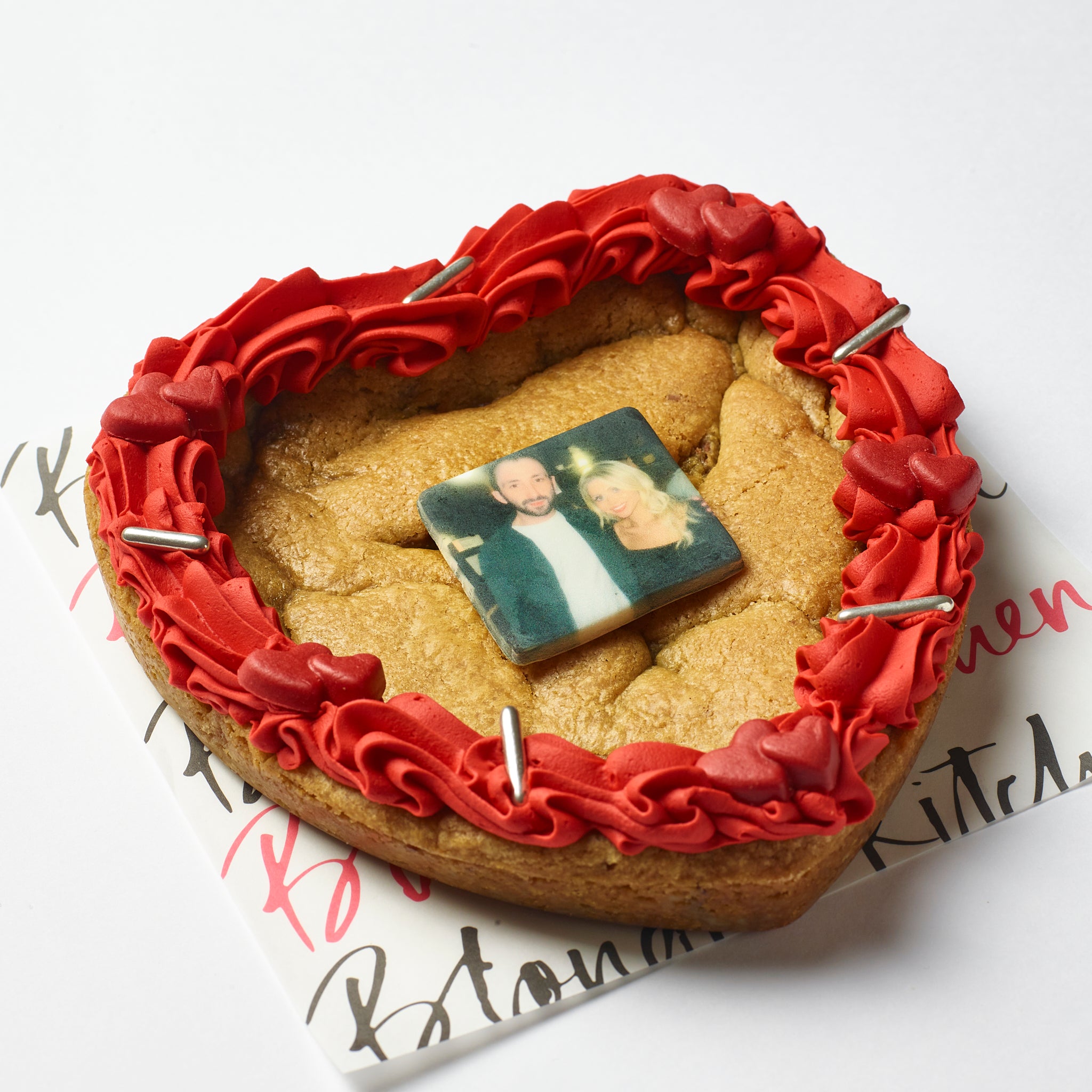 A brand new version of our bestselling Milk Choc Chunk Classic 7 inch cookie, in a heart shape, with a Red Icing Border topped with an edible fondant square in the middle.